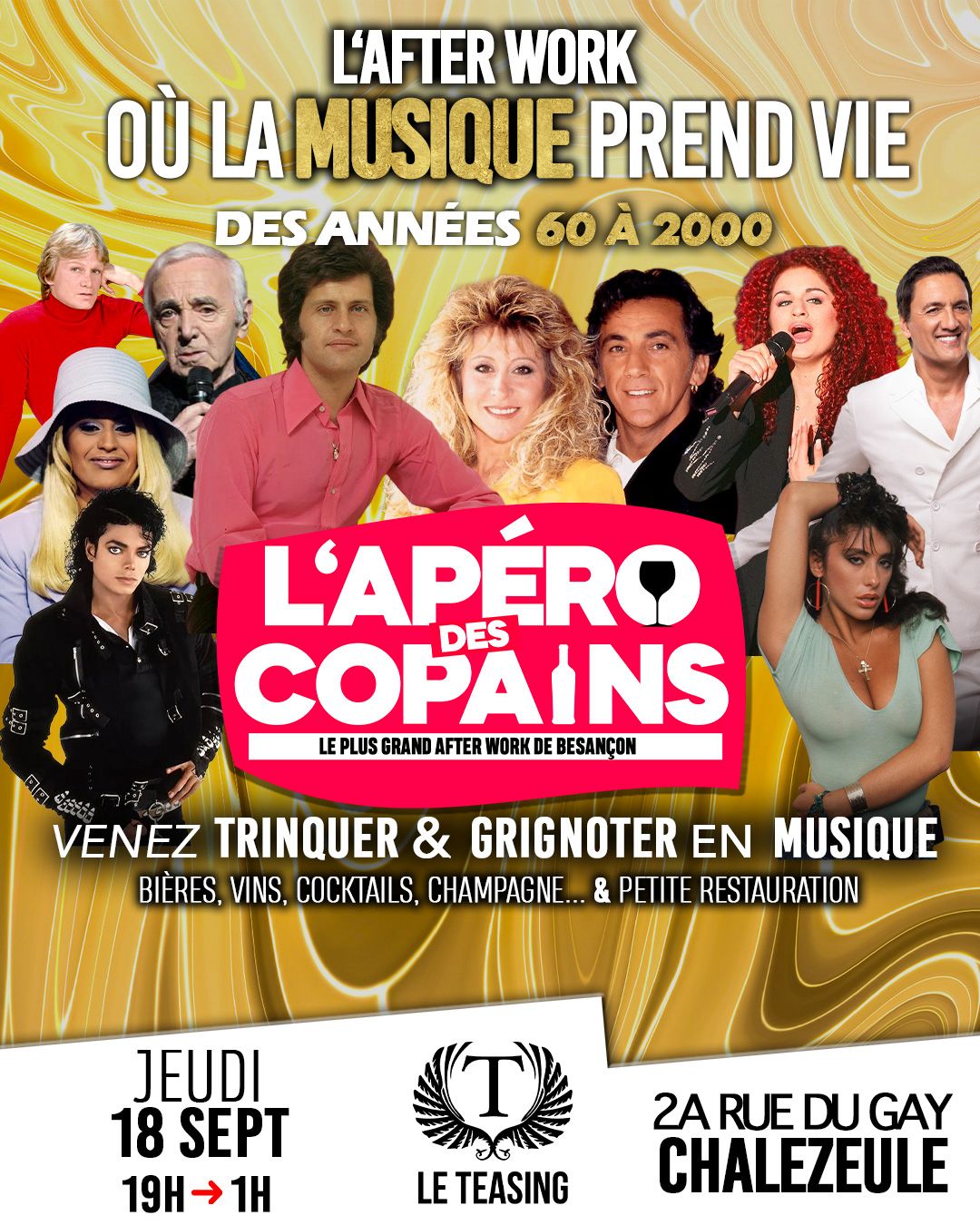 🎶✨ L’AFTER WORK OÙ LA MUSIQUE PREND VIE ✨🎶 Plonge dans l’ambiance des plus grands tubes des années 60 à 2000 🎤🔥 De Johnny à Dalida, de Mylène à Michael… retrouve l’esprit festif et convivial de l’Apéro des Copains 🍷🥂