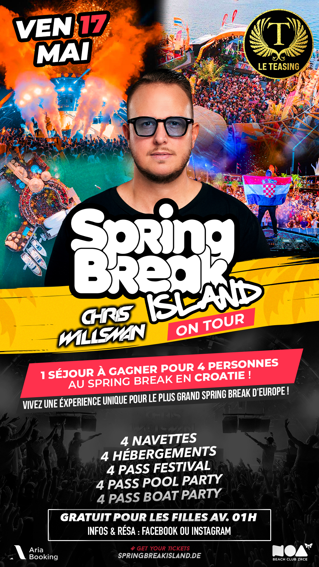 CHRIS WILLSMAN débarque au Teasing pour la SPRING BREAK ISLAND! Un séjour à gagner pour 4 personnes au Spring Break en Croatie!!! 4 Navettes – 4 HEBERGEMENT – 4 PASS FESTIVAL – 4 PASS POOL PARTY – 4 PASS BOAT PARTY!!! Ca va être Lourd!!!
